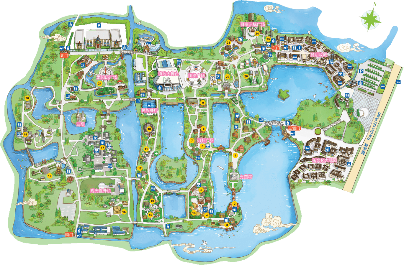 佤族人口約36萬,主要聚居在云南省瀾滄江南段以西的阿佤山區(qū)。佤族寨位于“翠漪洲”東南角。寨內(nèi)分布有茅草頂?shù)母蓹谑浇ㄖ骸⑴n^廣場、神靈廣場、司崗里石雕以及糧倉等。牛頭廣場是佤族古老的剽牛活動場所,場正中的牛角為佤族的寨樁,廣場前的兩個石人分別為佤族的男性和女性祖先。神靈廣場表現(xiàn)了佤族萬物有靈、靈魂不死的自然崇拜觀念。場中兩個石人雕像分別為佤族最崇拜的“木依吉”和“阿依娥”。佤族木鼓舞節(jié)拍鮮明強烈,...